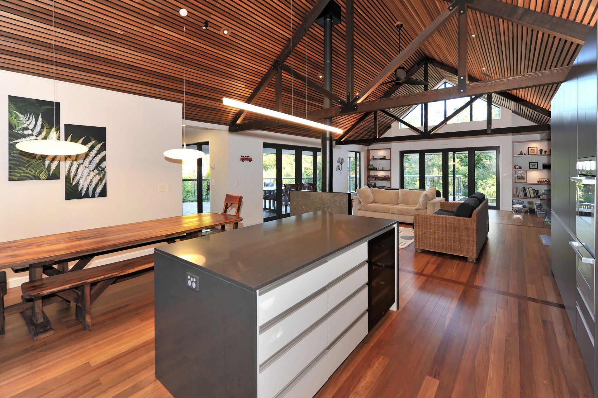 Focus worked closely with the architect and client to finalise the design of this extensive renovation, which completely transformed this three-level holiday home into a chalet-like haven. Focus managed the tender process and worked alongside the client to appoint Dan Anderson Building to the contract. The project was undertaken on a steep site and included extensive excavations to incorporate a self-contained two-bedroom apartment and new double garaging. The upper level was generously extended to accommodate the master suite and two private deck areas. While existing flooring and exterior framing were retained to preserve the home’s original character, structural steel beams and posts were installed to support cantilevered decking.