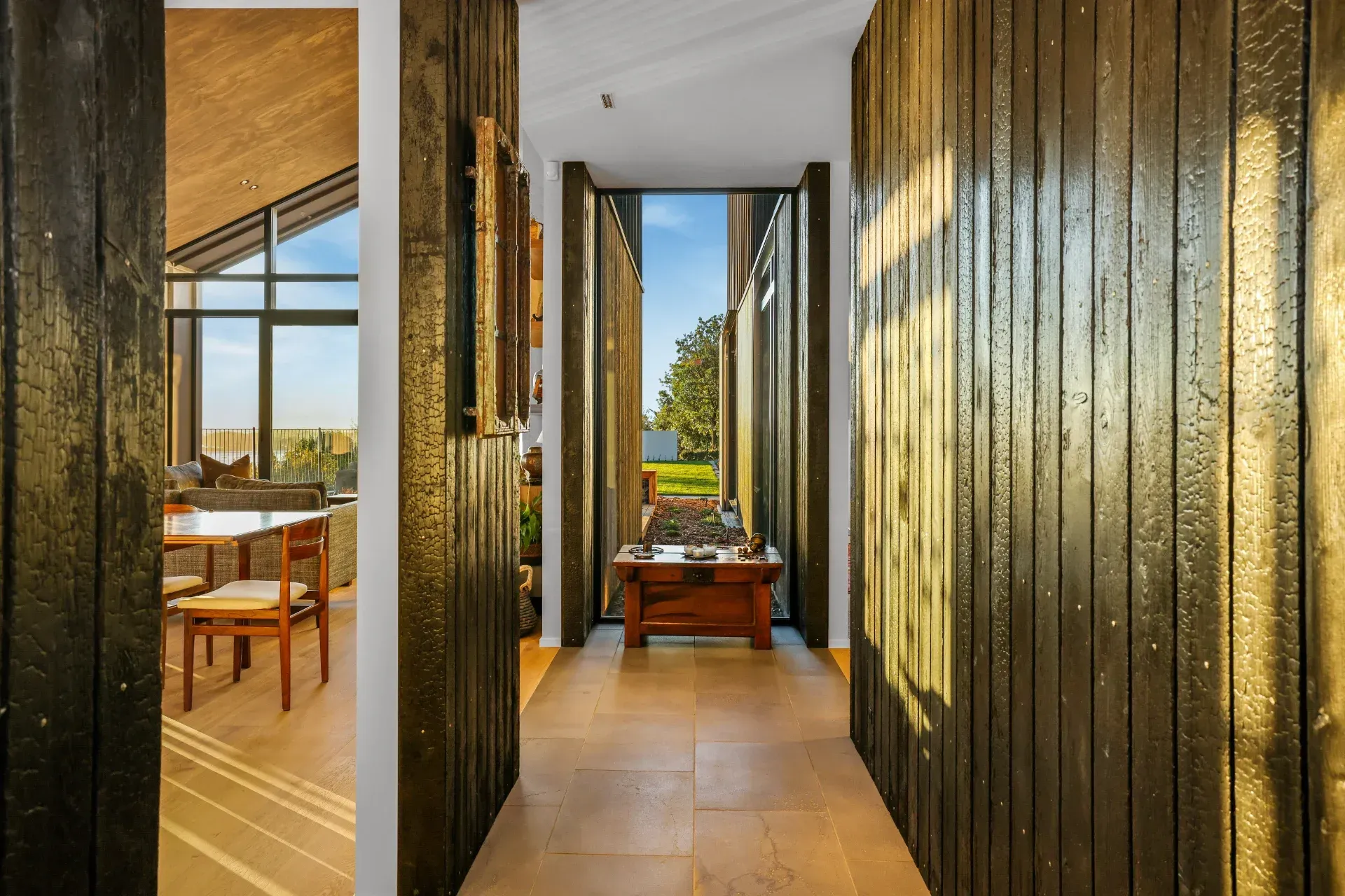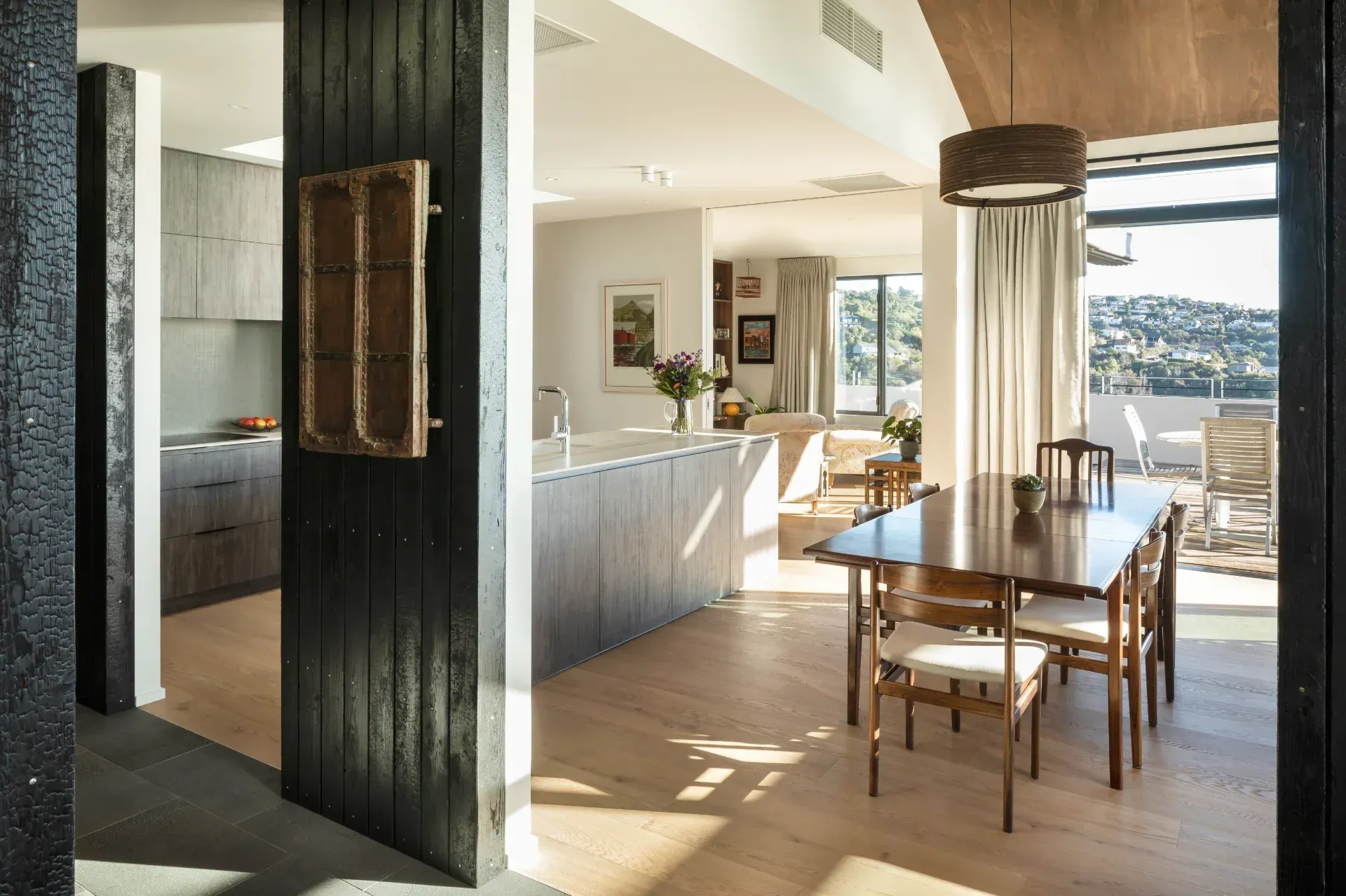 Natural light fills the interior, enhancing the home’s distinctive mix of Japanese-inspired screens and charred larch cladding. These elements are woven together to complement a rich, eclectic collection of worldly souvenirs, transforming this clever hillside oasis into a home full of originality, story, and warmth.